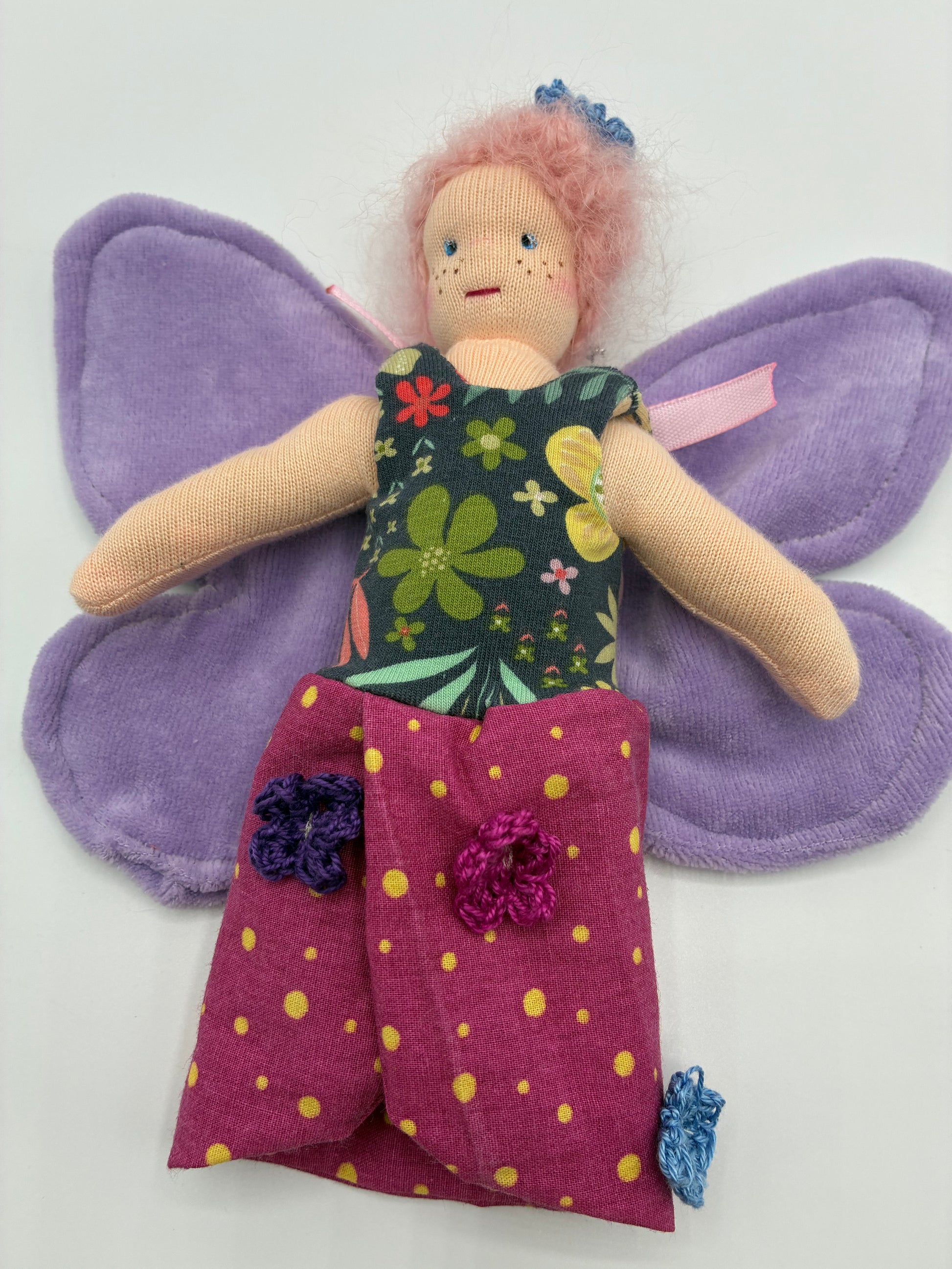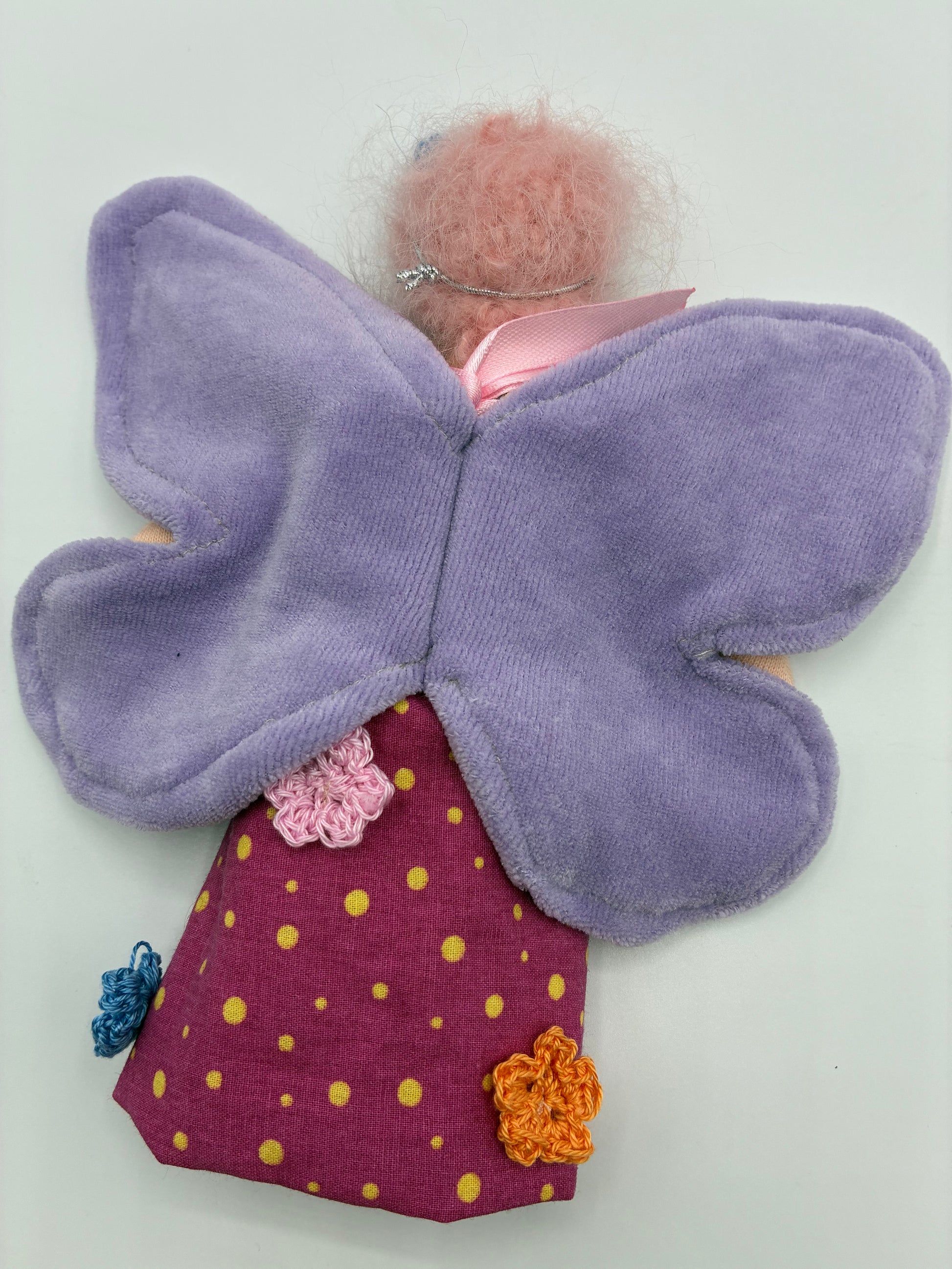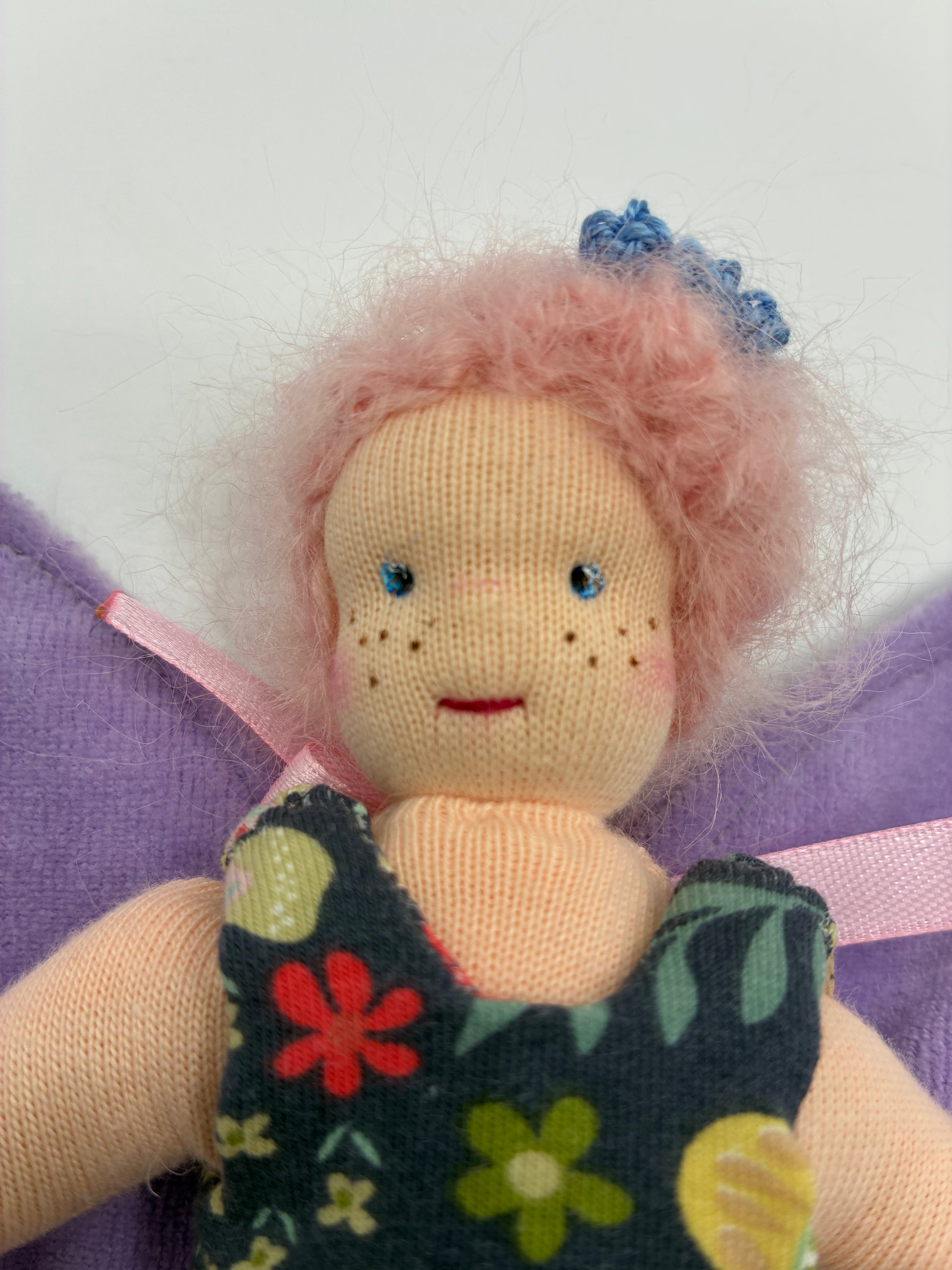 - Haare: rosa Haare aus feinstem Mohair, die der Fee einen zarten und lebendigen Look verleihen.
