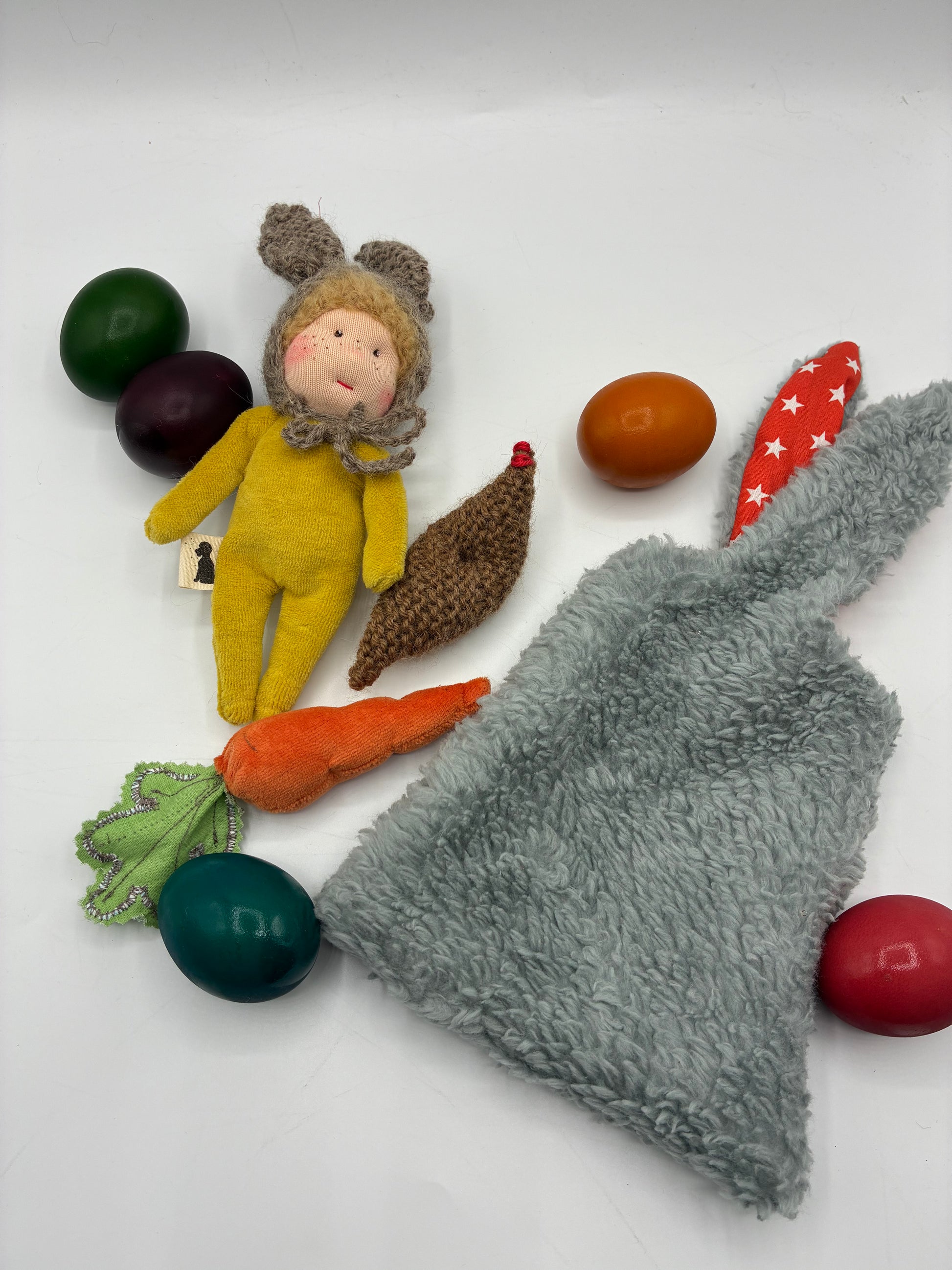 - Häschenmütze: Diese ist aus Schafwollegestrickt und abnehmbar – ein liebevolles Oster-Accessoire.