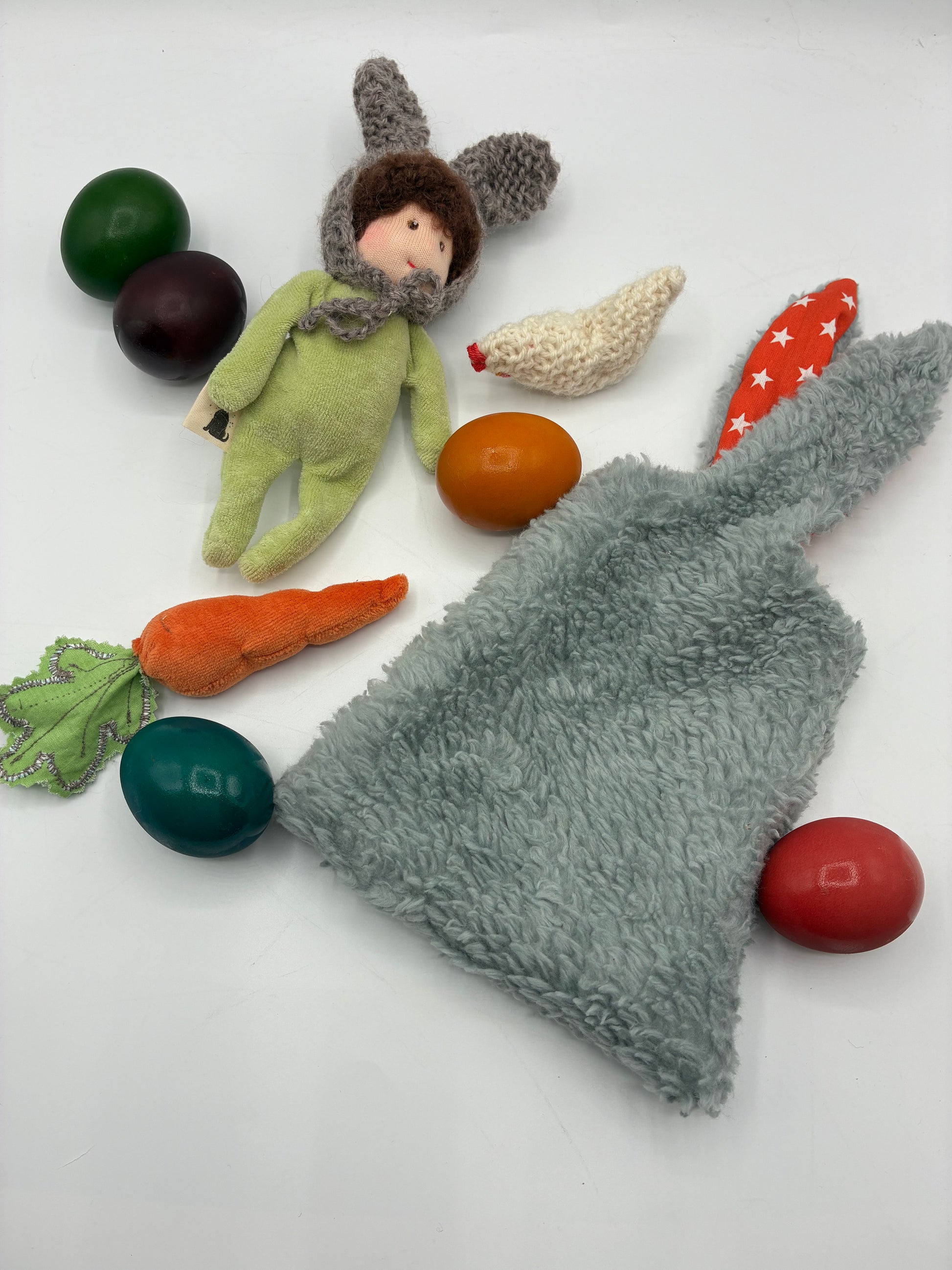 - Häschenmütze: Diese ist aus Schafwollegestrickt und abnehmbar – ein liebevolles Oster-Accessoire.