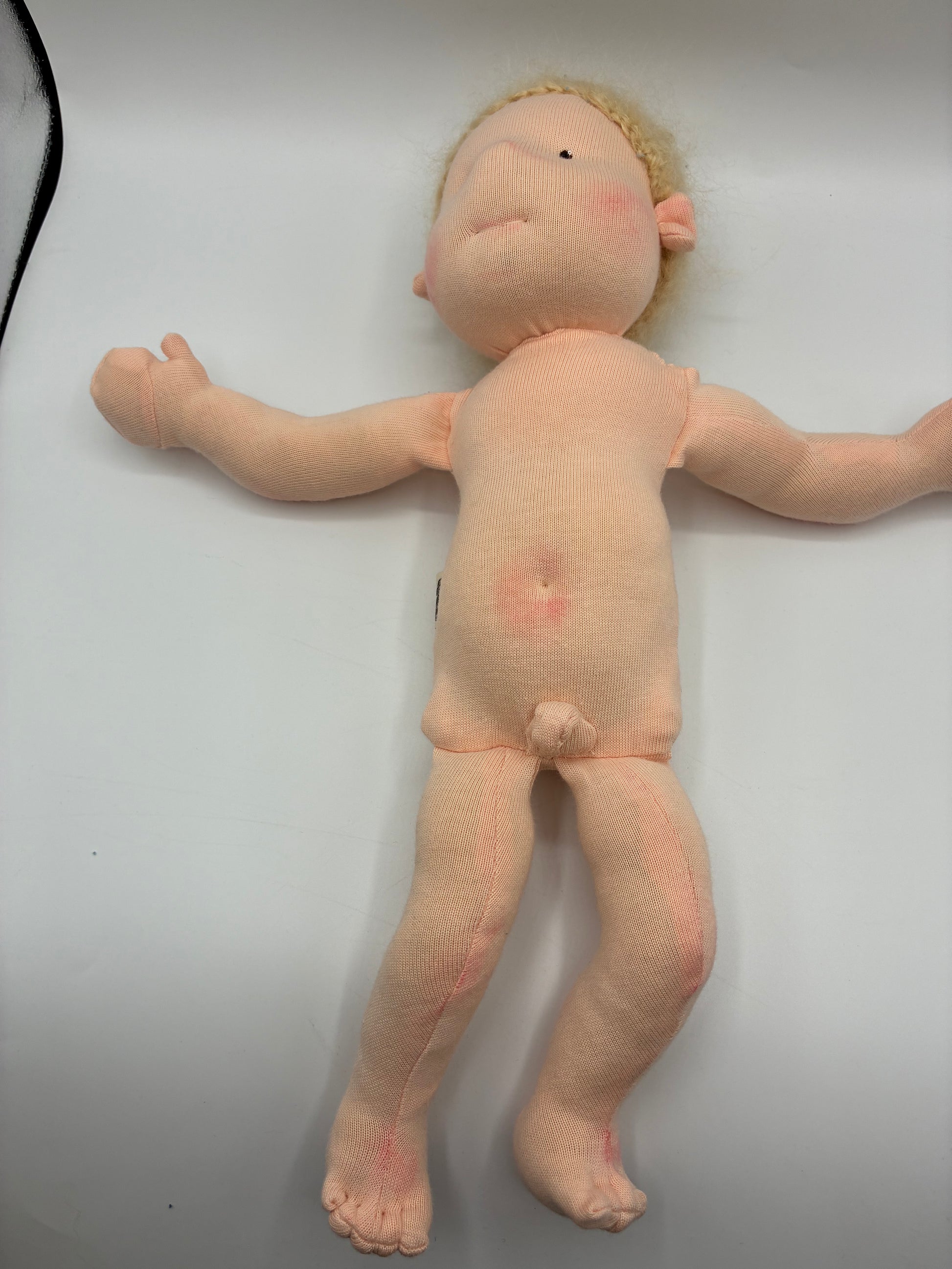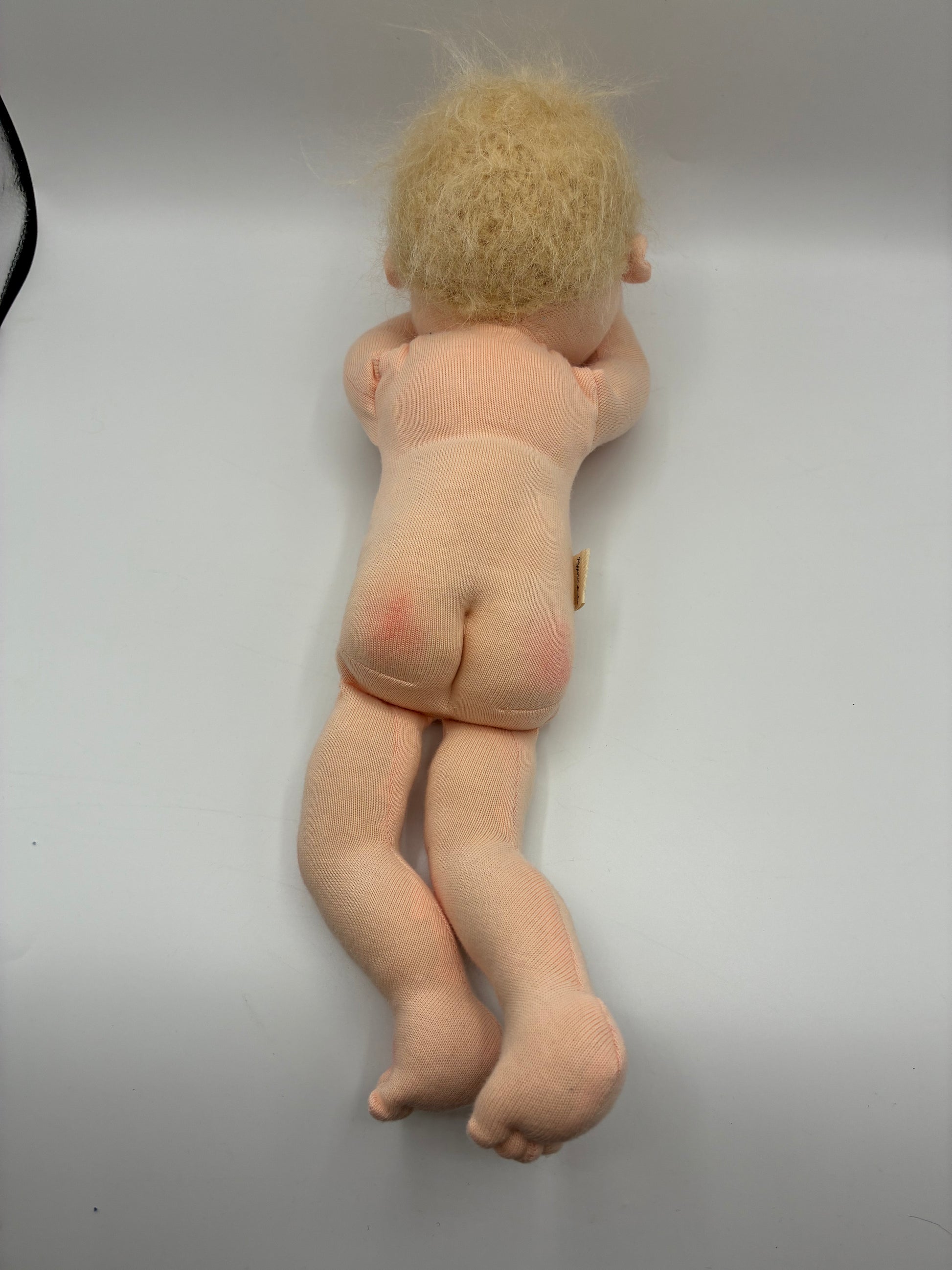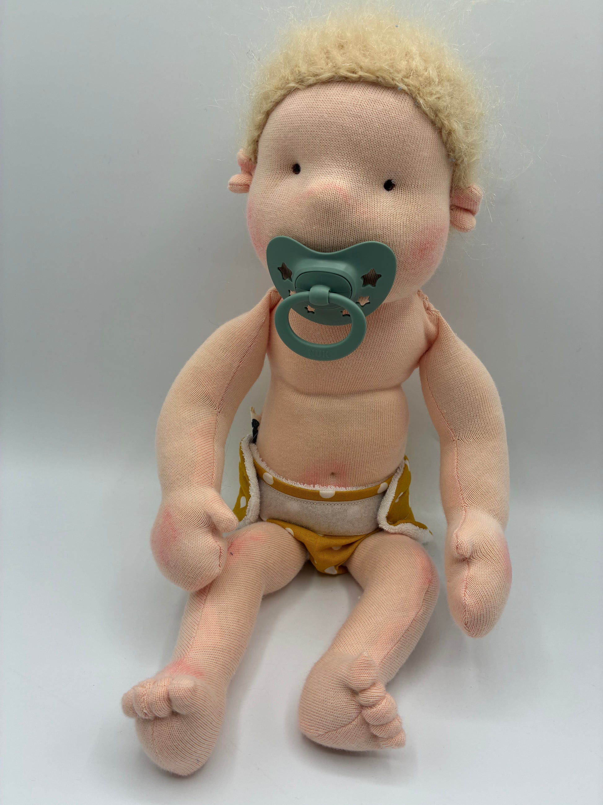 - Gesicht und Haare: Die Puppe hat braune Augen und blonde Haare aus hochwertiger Mohairwolle, die sanft und kuschelig sind.